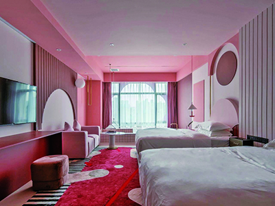 摒弃了传统酒店那些软包硬包后的墙面、平淡无奇的床头以及床头柜,就连卫生间镜面乃至每个客房内的浴缸和吊灯,都以圆形和圆拱形为主。仪式感浓重的圆弧造型与俏皮精怪的色彩搭配碰撞让人眼前一亮,再加上斜角的设计,让人感觉身处于一个二维空间,有一种梦幻般的立体感。
