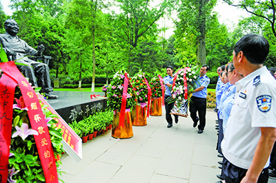 青松翠柏间,邓小平故里铜像广场显得庄严肃穆。上午10时许,民警们身着警服,在邓小平同志铜像前整齐列队,两名民警缓缓地将盛放菊花的花篮护送到铜像前,轻轻放下。花篮的红色缎带上写着“深切缅怀敬爱的邓小平同志”,寄托着大家对邓小平同志的无限敬仰和无尽怀念。