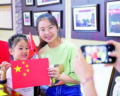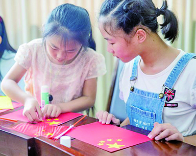随后,孩子们拿出了红色和黄色的纸、胶水、剪刀等手工材料,在志愿者的讲解下制作国旗,他们分工合作,有的画五角星、有的裁剪五角星、有的进行最后的粘贴,大家忙得不亦乐乎。一面面国旗在孩子们的努力下很快就完成了,鲜艳的国旗和孩子们可爱的笑脸交相辉映,构成了一幅美丽的画卷。制作完成后,孩子们挥舞着亲手制作的国旗,兴奋地和国旗合影,镜头将一张张真诚的笑脸和爱国之情定格在照片中。“好开心,了解了好多国旗方面的知识,还学会了制作国旗,我要把国旗带回家挂在最显眼的位置。”张玥玥高兴地说道。
