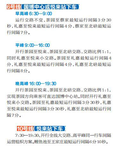 除4号线一期(民安大道—唐家沱段)运营时间为7:30—20:30外,其余线路运营时间均为6:30—22:30,智博会期间(2019年8月26日—29日),将调整6号线和10号线的运行交路和运行间隔。