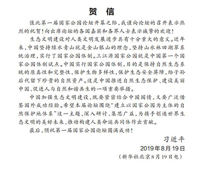 习近平在贺信中指出,生态文明建设对人类文明发展进步具有十分重大的意义。近年来,中国坚持绿水青山就是金山银山的理念,坚持山水林田湖草系统治理,实行了国家公园体制。三江源国家公园就是中国第一个国家公园体制试点。中国实行国家公园体制,目的是保持自然生态系统的原真性和完整性,保护生物多样性,保护生态安全屏障,给子孙后代留下珍贵的自然资产。这是中国推进自然生态保护、建设美丽中国、促进人与自然和谐共生的一项重要举措。