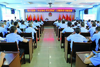 8月27日上午,监狱政治处主任朱敏主持专题党课,监狱领导参加党课学习。