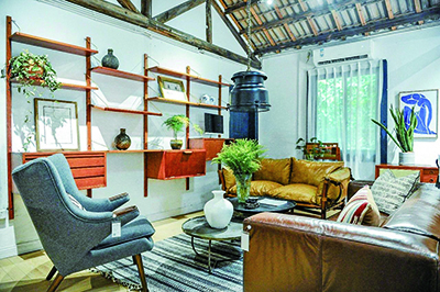 当我轻轻踏上这层被花草环绕的木质地板时,透过落地窗看见静姐正拿着相机在会客厅里寻找各个角度拍照。茶几上放着她的电脑,她从国外带回来的抱枕就随意地躺在沙发上,木质复古家具有条理地摆着,这些组合,让这个会客厅变成了客厅。