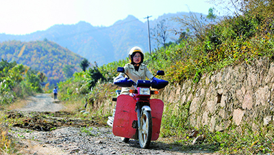 工作之初,如何开局?严克美急得睡不着觉,半夜起床开灯发呆。彻夜难眠之后,她决定实地走访村民,为了节约时间,严克美找父亲借了6000多元钱,买回一辆150型男士摩托车,摇摇晃晃地骑着上路了。不久,由于道路艰辛,她骑着摩托车径直冲下悬崖。万幸的是,人和车都被树拦下,倔强的她抹了抹眼泪,出院之后,又上路了。娇小的个子,穿着风衣骑上男士摩托,这位80后“女骑手”在崇山峻岭中骑出了自己的一番天地。