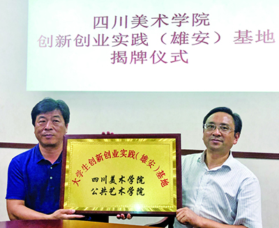 雄安新区安新县人社局张赶财局长与四川美术学院彭林权副校长共同为四川美术学院公共艺术学院大学生创新创业实践(雄安)基地揭牌