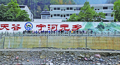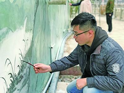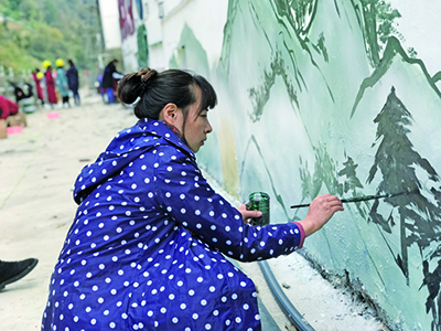 老师和同学们积极投入绘制,合理分配绘画区域,调色、上色、勾线……老师指导、把控,同学爬上高高的脚手架认真操作。11月5日,四川美术学院党委副书记左益及市教委扶贫集团莅临现场慰问。