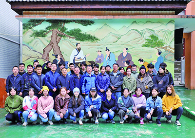 师生协力经过3天马不停蹄的奋战,11月6日,圆满完成《孔子讲学图》与《天元山水图》两幅墙绘作品绘制,并与四川美术学院党委副书记左益及市教委扶贫集团合影留念。历时三天的艺术扶贫活动结束后,全体师生在7日凌晨左右返回学院。