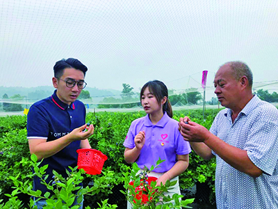 在演播厅外的直播分会场,“山茶花”脱贫攻坚志愿者蔡可阳正带领大家在潼南区上和镇挑选蓝莓,另一名志愿者刘尊则在卧佛镇推介贫困户手工编织的草编蒲扇。随着直播镜头的不断切换,潼南“红玫瑰蜜李”“火焰桃”“手工草编蒲扇”“蓝莓”“金丝皇菊”等众多农特产品逐一亮相。近两小时的直播,吸引了近10万人次观看,累计成交900余单,销售金额5万余元。