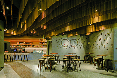 星巴克朝天门来福士店的空间设计灵感来源于咖啡文化与重庆本地特色的创新式融合:重庆大江大河的城市地貌,重庆人大开大合的直爽性格,以及重庆美食大麻大辣的独特风味,都在星巴克臻选™精心打造的第三空间里与咖啡不期而遇,为顾客及“星粉”开启独具重庆城市气息的星巴克臻选™探索之旅。