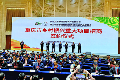 11月28日,在第十八届中国国际农产品交易会暨第二十届中国西部(重庆)国际农产品交易会期间,举行了重庆市乡村振兴重大项目集中招商签约仪式,共签约52个项目,签约金额达338.63亿元。
