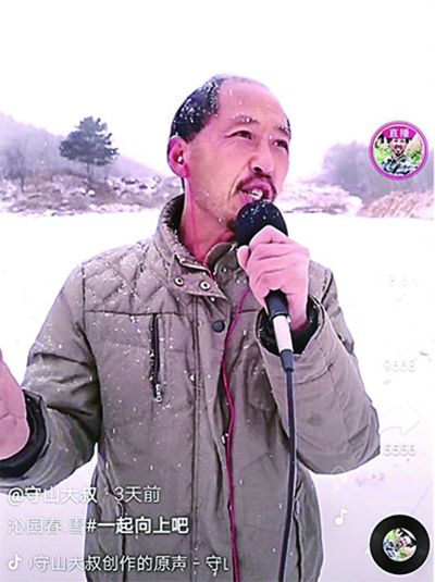 在“守山大叔”的短视频里,原生态的农村风光是一大特色。早上喂完鸡,他就在鸡棚前,架起手机唱上一段,身后的走地鸡,自在地踱步觅食,十分生动。11月21日,承德下了今年冬天的第一场雪,于新伟站在田边放声歌唱,身后皑皑白雪覆盖着大地,一首歌录完,连他的眉毛也变白了。