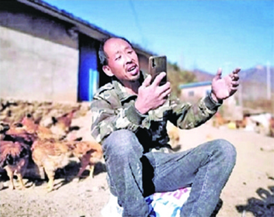 画面中的于新伟穿着牛仔裤和半新的迷彩外套,站在长着松树和杂草的黄土坡前,直播的设备就是一只他日常使用的手机,再加上耳机和话筒。“都是我媳妇从网上买的。”于新伟说。