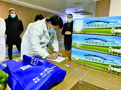 医院社会服务处的工作人员急忙进行分装,17箱羊肉被均匀地分成了45份,等待着医院45名支援湖北的医疗队员前来领取。