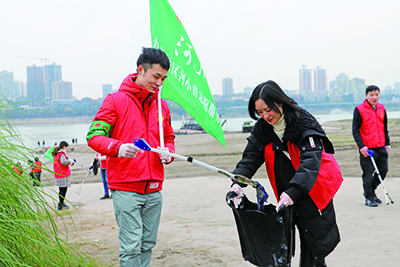 在长江边上,青年志愿者们身穿红马甲,手持钳子,拿着垃圾袋,分工合作、互相配合,将散落在岸线周边的白色垃圾、玻璃瓶、易拉罐等垃圾、杂物捡起并收集存放到垃圾袋内,以便进行集中处理。经过“河小青”志愿者们的辛勤劳动,有效改观了江畔的卫生环境,长江九渡口港湾码头河段重现秀美真容。