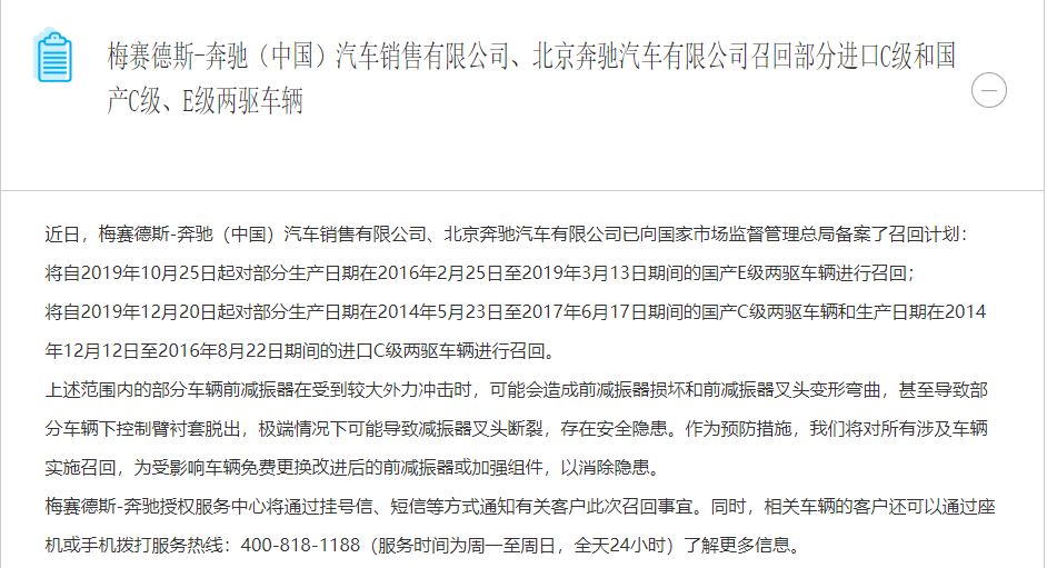汽车咖啡馆近日获悉,北京梅赛德斯-奔驰销售服务有限公司已向用户发布缺陷汽车产品召回通知书,将自2019年10月25日起对部分生产日期在2016年2月25日至2019年3月13日期间的国产E级两驱车辆进行召回。该公司表示,依据《缺陷汽车产品召回管理条例》和《缺陷汽车产品召回管理条例实施办法》的相关规定,我司决定对本通知中所涉及的缺陷汽车产品实施召回,以消除安全隐患。