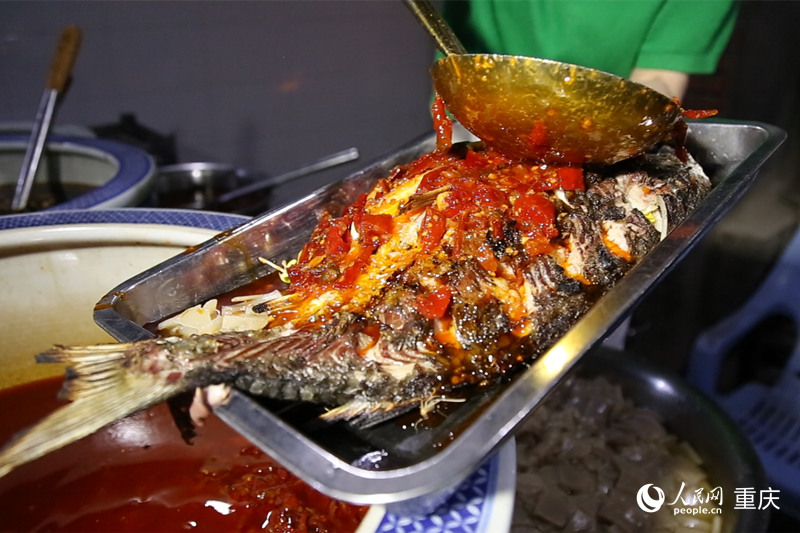 烤鱼出炉后淋上泡椒酱。人民网 刘祎摄