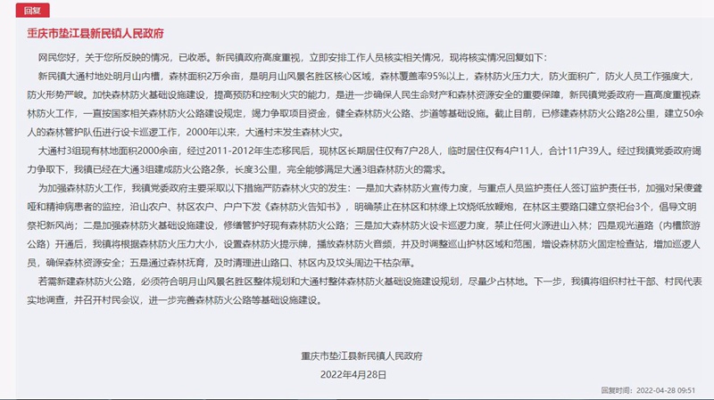 “新民镇大通村三组位于明月山主峰——峰顶山东麓、双河水库大坝内侧,东至双河水库,南至北沙洞,西至明月山内槽旅游观光大道,北至北辣沟,林农达40多户300多人。森林覆盖率几乎100%,林地总面积近4000亩,属于森林防火重点区域。”4月19日,重庆市垫江县网友在留言中称。