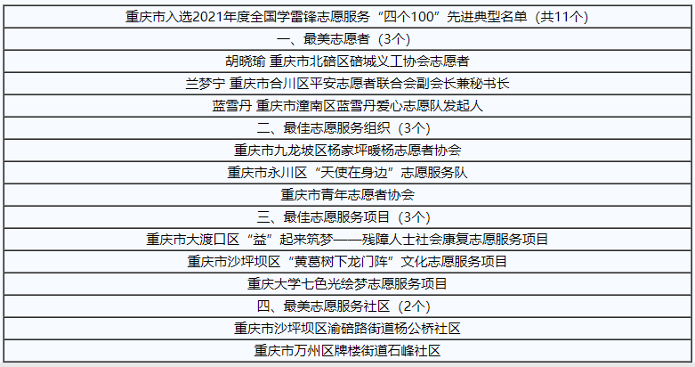 近日,中宣部、中央文明办等18部门公布了2021年度全国学雷锋志愿服务“四个100”先进典型名单,重庆3名最美志愿者、3个最佳志愿服务组织、3个最佳志愿服务项目、2个最美志愿服务社区入选。