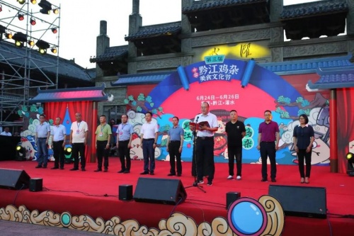 19时,在数千观众的翘首企盼下,热烈而又喜庆的“第三届中国黔江鸡杂美食文化节开幕式”伴随着《濯水喜事》节目炫丽登场。舞蹈《暗河船夫》,歌曲《向往黔江》等节目精彩呈现,台下时时掌声如潮。随即,当何福元、曾祥远分别为集“洪崖洞洞主”“中国文化十佳风云人物”“重庆直辖十年建设功臣”“重庆火锅协会会长”等荣誉于一身的何永智以及土家十三寨寨主李佳授予“黔江鸡杂宣传推广大使”牌匾时,现场雷鸣般的掌声更是将活动带入高潮。