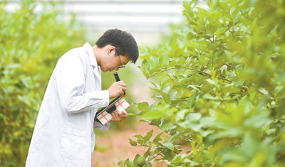 科研人员在潼南柠檬脱毒种苗繁育中心查看树苗长势。 龙 帆摄