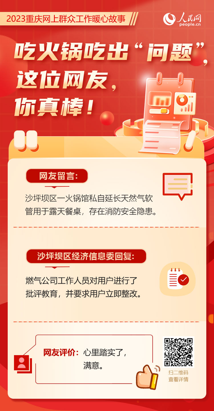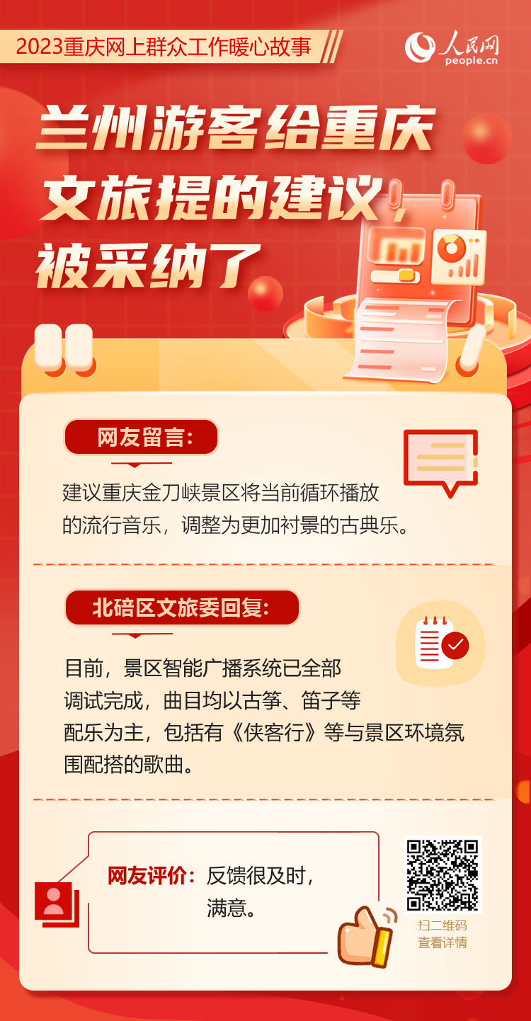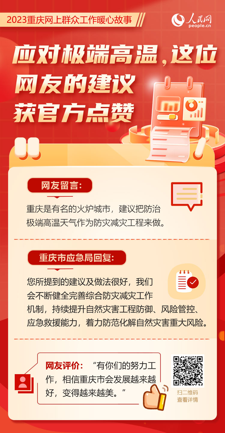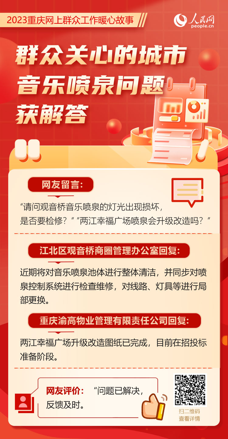 2023年,重庆各地各部门通过人民网“领导留言板”共收到群众有效留言9716件,回复群众急难愁盼9456件。人民网重庆频道推出特别策划——《2023重庆网上群众工作暖心故事》,盘点过去一年重庆网上群众工作的暖心故事。