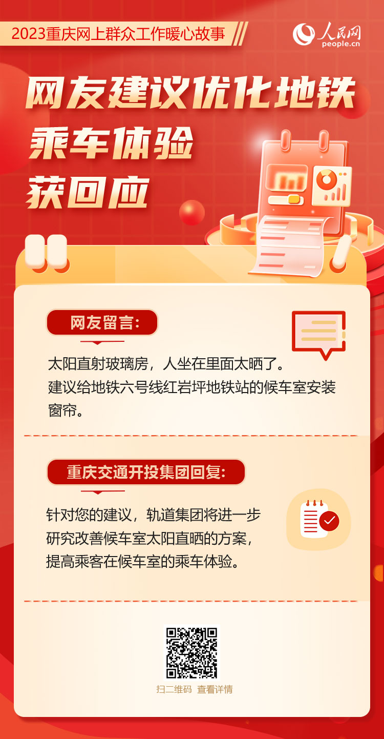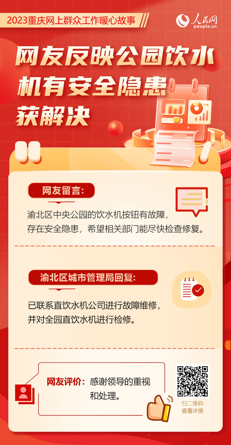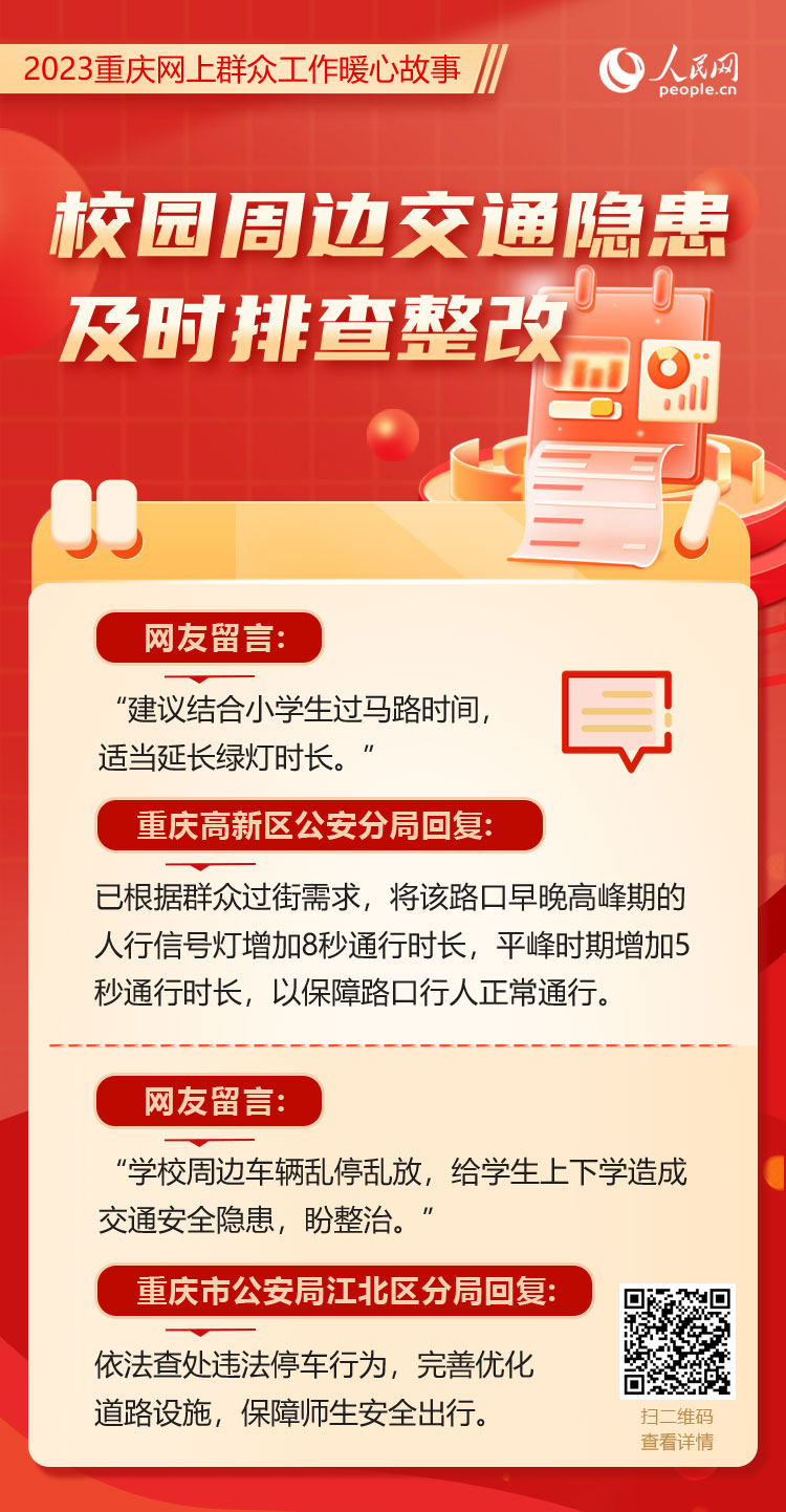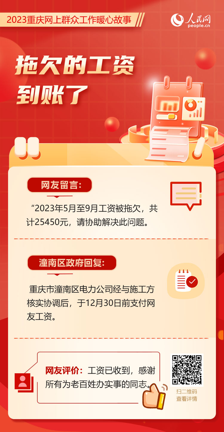 2023年,重庆各地各部门通过人民网“领导留言板”共收到群众有效留言9716件,回复群众急难愁盼9456件。人民网重庆频道推出特别策划——《2023重庆网上群众工作暖心故事》,盘点过去一年重庆网上群众工作的暖心故事。