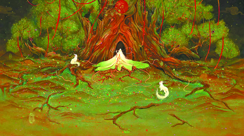 然而,提到这一系列的创作,舍溪却表示,最开始的体会是“痛苦”的,最初画的《境》系列的前两张,她都非常不喜欢。“总感觉角色的位置和内容都不对,构图也是错的。可是,我不知道问题出在哪里,只是看画的时候,觉得整个风格是厚涂油画式的,看起来太腻了,没有任何的吸引力。”她只能推倒重画,却仍旧不喜欢,只能接着修改。改至第三版时,她已花费了一个月的时间。“画的主体不够突出,又不知道要表达什么。当时,我刚从深圳回到老家,我的心里浮躁又迷茫。在我的设定里,整张画面应该是温馨的,人物和神兽之间是有互动的。”