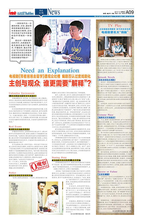 A09-电视剧《带着爸爸去留学》遭观众吐槽 编剧否认过度戏剧化