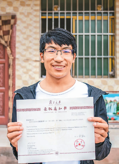 宁海民族中学第三届“海安班”学生苏文杰展示不久前收到的复旦大学录取通知书。