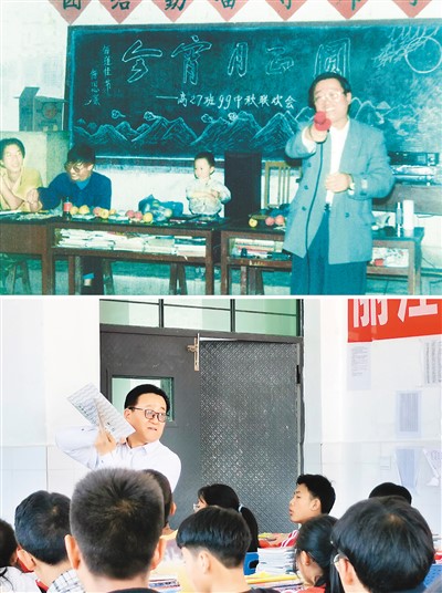 上半图为1999年9月,海安老师王霖伯在宁蒗宁海民族中学高27班教室过中秋节;下半图为2021年4月23日,王霖伯在宁蒗二中高103教室上课。新华社发