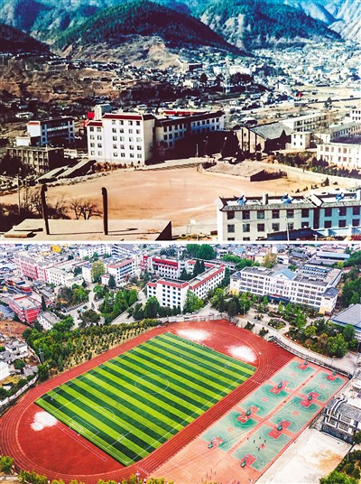 过去,宁海县办学条件艰苦,海安支教老师和当地教师一样住着用木板隔开的简易宿舍、喝着浑浊的水,常常因变压器跳闸而用不上电,但他们仍坚持不懈,辛勤耕耘。如今,当地办学条件早已大大改善。上半图为20世纪90年代的宁海民族中学;下半图为宁海民族中学新貌。新华社发