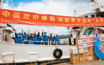 1月24日,在斐济首都苏瓦的渔船码头,运送中国政府援助汤加救灾物资的中水集团公司渔船准备起航。 |