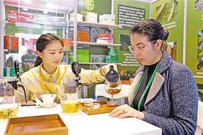 今年进博会期间,一名巴西参观者(右)在36庄园展位前品尝老挝古树茶。 |