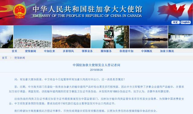 中方将暂停所有加拿大肉类对华出口?使馆回应