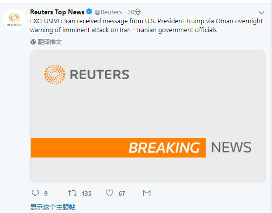 路透社称伊朗已经收到了美国即将发动袭击的的消息