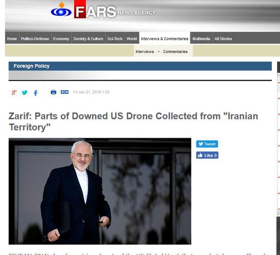 伊朗外长:在伊领海找到被击落美国无人机部分残骸