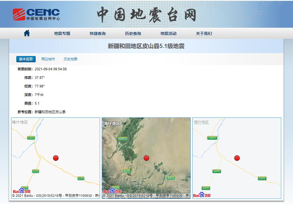 新疆和田地区皮山县发生5.1级地震 震源深度7千米