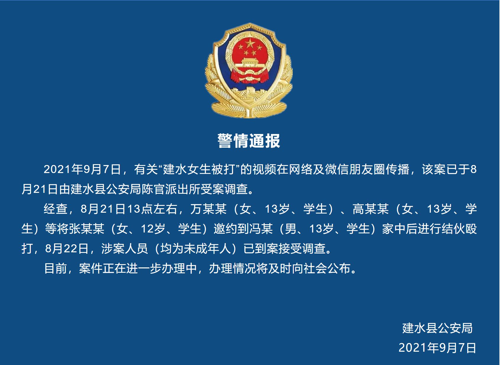 据云南省建水县警方通报,2021年9月7日,有关“建水女生被打”的视频在网络及微信朋友圈传播,该案已于8月21日由建水县公安局陈官派出所受案调查。