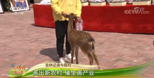 近年来,今胜村还利用距离县城近的区位优势大力发展乡村旅游,年接待旅游人数2万人左右,带动农民就业170多人。我现在就来到了今胜村的一家农家乐的门前,今天是周六,这里非常热闹。除了游客,十里八村的农民画创作者也聚集在此交流技艺。在这里我们发现了几只可爱的小鹿,东丰不但农民画出名,这里的梅花鹿养殖业也非常有名。当地农民跟我说,这里的梅花鹿从小就跟人待在一起,根本不怕人,当地农民把梅花鹿放在农家乐里跟游客互动,不得不说这是一个非常好的主意。