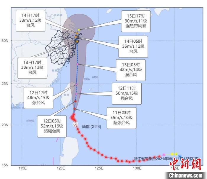 台风“灿都”11日11时中心距离台湾地区宜兰县偏南方向约445公里的巴士海峡内,中心附近最大风力16级(55米/秒)。预计台风将以每小时10-15公里左右的速度向偏北方向移动,12日夜里移入东海海面,并逐渐向浙江东北部靠近。