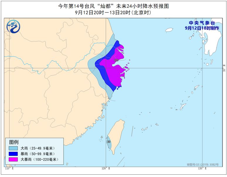 降水预报:12日20时至13日20时,江苏东南部、上海、安徽东南部、浙江大部等地的部分地区有大到暴雨,其中,上海、浙江北部和东部、江苏东南部的部分地区有大暴雨(100~220毫米)。上述部分地区伴有短时强降水(最大小时降雨量20~50毫米,局地可超过60毫米),局地有雷暴大风等强对流天气。