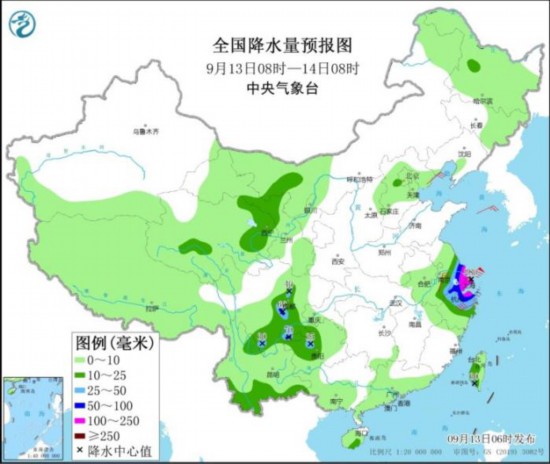 9月13日8时至14日8时,江淮东南部、江南东北部、四川盆地西部和南部、贵州西部、云南南部、内蒙古西部、甘肃河西、青海东北部和中南部等地的部分地区有中到大雨,其中,江苏东南部、上海、浙江北部的部分地区有暴雨或大暴雨,局地特大暴雨(250~280毫米)。河北东部、江南东北部等地的部分地区有5~7级及以上风。