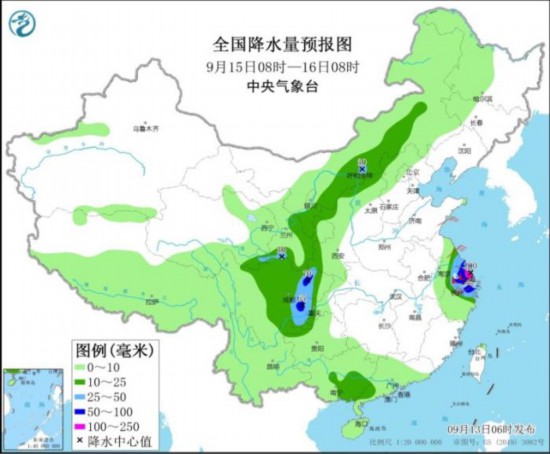 9月14日8时至15日8时,内蒙古西部、青海东部和南部、甘肃河西、宁夏北部、江淮东南部、江南东北部、四川盆地西部和南部等地部分地区有中到大雨,其中,江苏东南部、上海、浙江北部等地部分地区有暴雨或大暴雨(100~230毫米)。辽东半岛、江淮东部、江南东北部等地部分地区有5~7级风,局地有8~9级风。