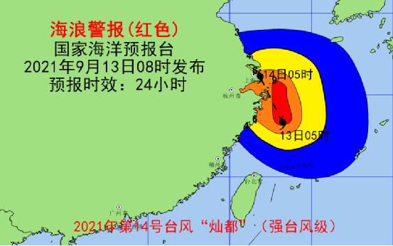 同时,海浪预警级别也维持红色,9月13日中午到14日中午,东海将出现6到9米的狂浪到狂涛区,该近海海域海浪预警级别为橙色;上海、浙江北部近岸海域将出现4到6米的巨浪到狂浪,该近岸海域海浪预警级别为红色;江苏南部近岸海域将出现3到4米的大浪到巨浪,该近岸海域海浪预警级别为黄色;浙江南部近岸海域将出现2.5到3.5米的大浪,该近岸海域海浪预警级别为黄色。