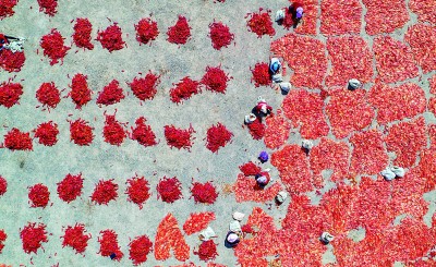 9月11日,在新疆维吾尔自治区库车市伊西哈拉镇红旗社区晾晒地,群众抢抓天气晴好时机,将丰收的辣椒进行分拣晾晒。今年,库车种植辣椒面积超过3万亩,预计湿辣椒产量达10万吨,辣椒已成为助推乡村振兴和农民增收致富的重要产业。袁欢欢摄/光明图片