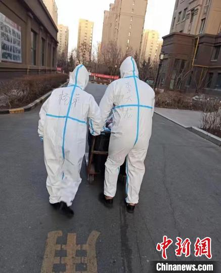 从此,小区邻居经常看到一个“女大白”和一个身穿防护服的大男孩并肩推车送菜的情景。