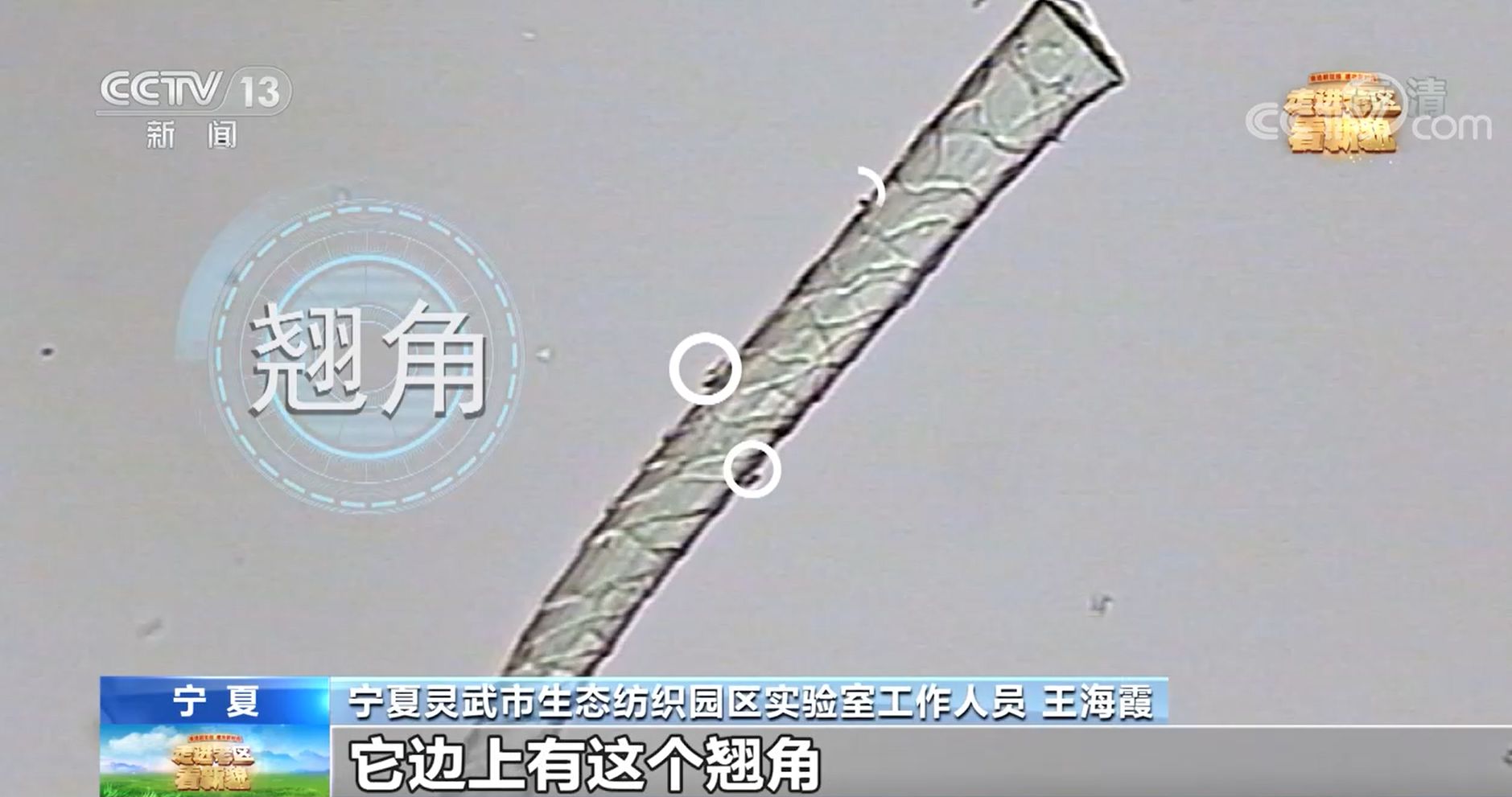 宁夏灵武市生态纺织园区实验室工作人员 王海霞:羊毛纤维大家看到了,它边上有这个翘角,贴身穿的话会有刺痒感。那我们现在有一个技术,就是把我们羊毛那个翘出来的角剥掉一点点。(一点点有多少?)0.2个微米,约等于我们头发(直径)的三百分之一。