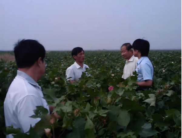 2011年8月,包津燕(右一)在棉田勘验。受访者供图