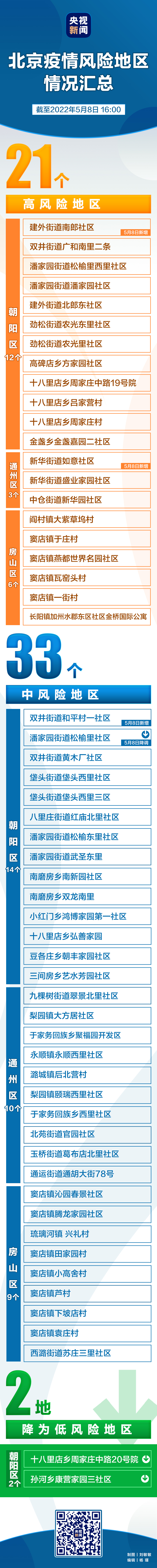 截至目前,北京全市共有高风险地区21个,中风险地区33个。