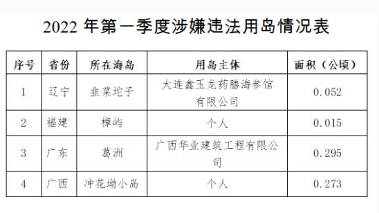 发现并制止涉嫌违法用岛4处,面积约0.63公顷。其中,辽宁省1处,面积约0.05公顷;福建省1处,面积约0.02公顷;广东省1处,面积约0.29公顷;广西壮族自治区1处,面积约0.27公顷。